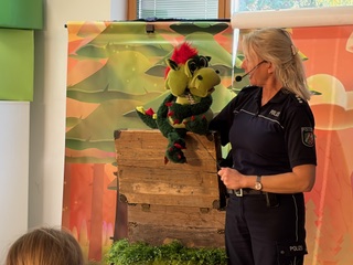Die Klassen 1 hatten Besuch vom Verkehrsdrachen Feo. Feo hat gelernt, wie man die Straße richtig überquert und durch kleine Reflektoren sichtbarer wird. Wir hatten dabei viel Spaß mit der Polizistin und dem Drachen. Immer wieder konnten wir Kinder Feo helfen, alles richtig zu machen.
