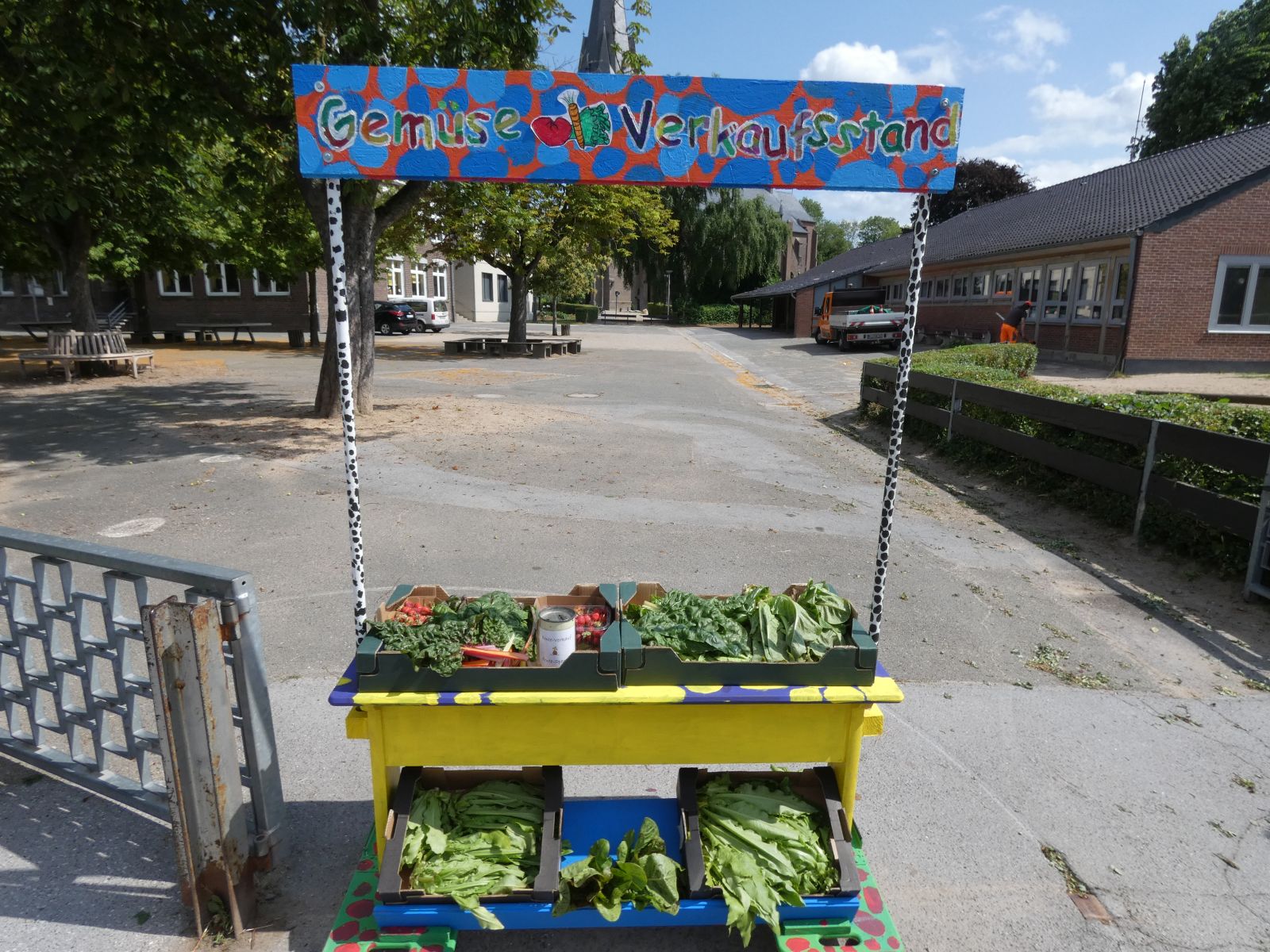 In unserem dritten Ackerjahr 2023 ist ein besonderes Projekt entstanden: Unser Verkaufsstand! Herr Winands hat einen alten Schultisch auf Rollbrettern befestigt und für das Schild ein Brett und zwei Stiele daran angebracht. Die Klasse 4b hat diesen, unter der Leitung von Frau Martell, bemalt. Diese Neuheit erleichtert uns nun die montäglichen Verkäufe und spricht zusätzlich noch unsere Kunden an. Ein Gewinn der rundum begeistert.